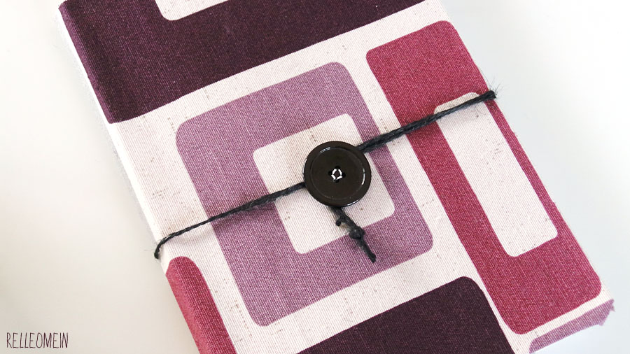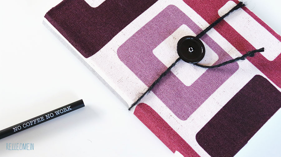 Dieses dicke Notizheft hat einen Einband aus Stoff bekommen, einen Knopf und eine schwarze Kordel zum verschließen.