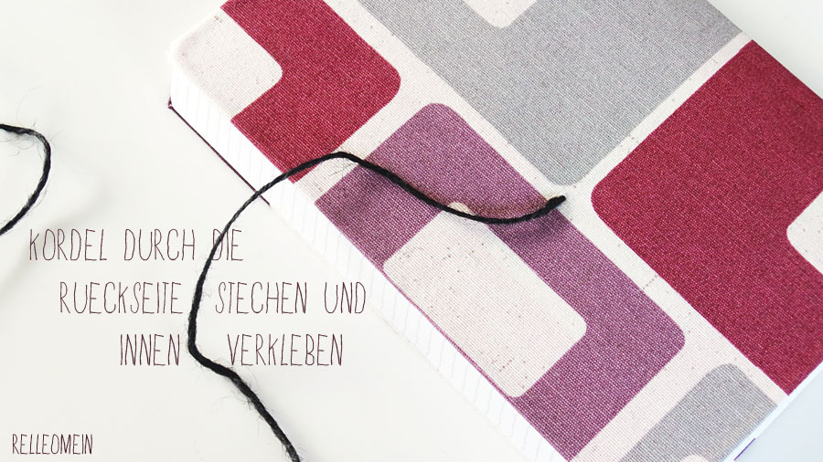 Auf der Rückseite des Notizheftes bringst Du die Kordel an. Dazu stichst Du ein Loch in den Einband und fädelst die Kordel hindurch. Auf der Innenseite klebst Du ungefähr vier Zentimeter der Kordel fest. Aussen sollte die Kordel so lang sein, dass Du sie anderthalb mal um das Notizheft wickeln kannst. Auch hier klebst Du die letzte Seite des Heftes bzw. ein Stück Papier innen auf den Einband um die Kordel zu verstecken.