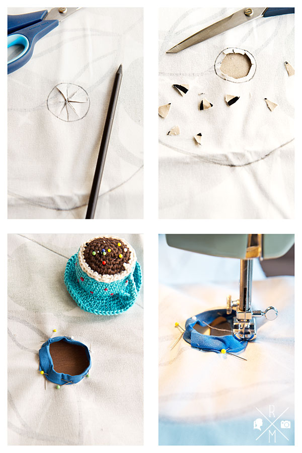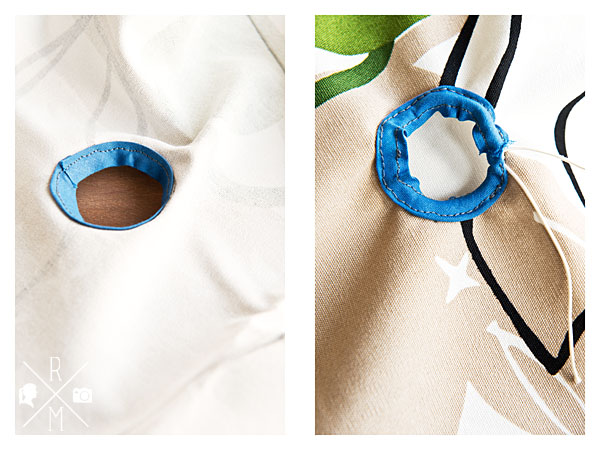 Im unteren Drittel schneidest Du ein Loch in den Stoff, durch das Du später die Tüten heraus nehmen kannst. Dann kannst Du das Loch entweder per Hand säumen oder wie ich mit einem Schrägband einfassen. Das ist allerdings etwas kniffelig, da das Loch recht klein ist mit einem Durchmesser von ca. 4 Zentimetern.