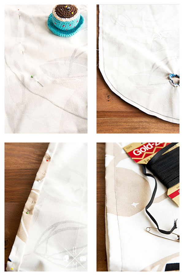 Nun wird die obere Öffnung gesäumt, durch die Du dein Tütenkabinett später befüllst. Dazu faltest Du die obere Kante zweimal nach innen und steckst sie mit Stecknadeln fest. Achte dabei darauf, dass hierbei ein Tunnel entsteht durch den Du das Gummiband ziehen kannst. Am unteren Rand steppst Du einmal rundherum und lässt am Ende 2 Zentimeter offen.