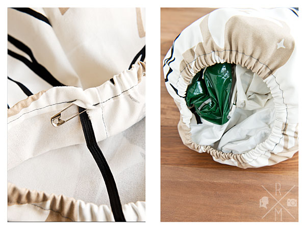 Durch diese kleine 2 cm große Öffnung, ziehst Du mit Hilfe einer Sicherheitsnadel das breite Gummiband ein. Die Enden des Gummibandes knotest Du fest zusammen. Zum Schluss füllst Du alle deine Plastiktüten hinein und ziehst das Gummiband zusammen. Fertig ist ein – wie ich finde – sehr praktischer kleiner Ordnungshelfer.