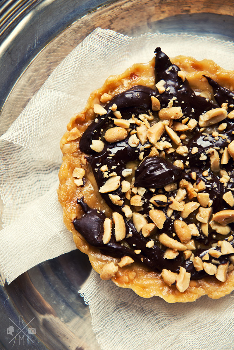 Jetzt ist es Zeit die kleinen Törtchen zu füllen. Dazu gibst Du die Erdnussbutter-Tofu-Mischung auf die gebackenen Böden streichen. Die Schokoladencreme (die auch hervorragend auf einem Sonntagsbrötchen schmeckt) kunstvoll auf den Törtchen verteilen und anschließen mit den gerösteten Erdnüssen bestreuen.