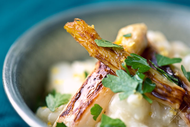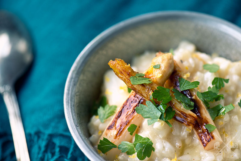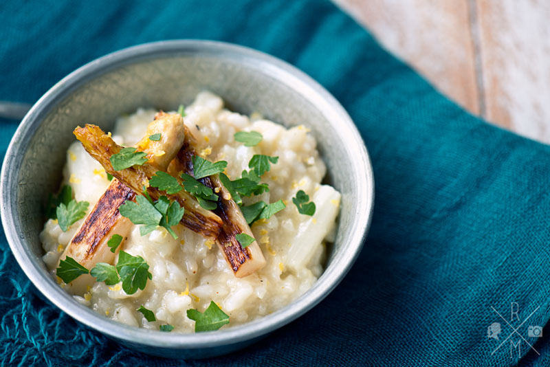 100 g geriebenen Parmesan und den Saft einer halben Zitrone unter das Risotto rühren und mit Salz und Pfeffer abschmecken. Ein großes Stück Butter dazu geben, Deckel drauf und ein paar Minuten ziehen lassen.